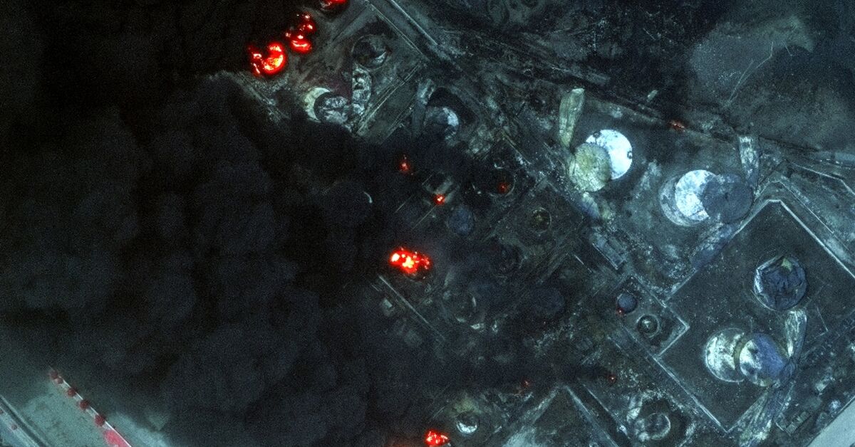 High-resolution satellite images taken by Maxar Technologies showed flames consuming a heavily damaged fuel storage area, which still appeared to be burning on Monday, according to an AFP correspondent.