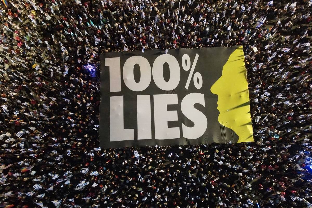 Every week on Kaplan Street, a large banner with a main slogan is displayed. This week’s banner featured Netanyahu’s silhouette with the “100% lies” on it.