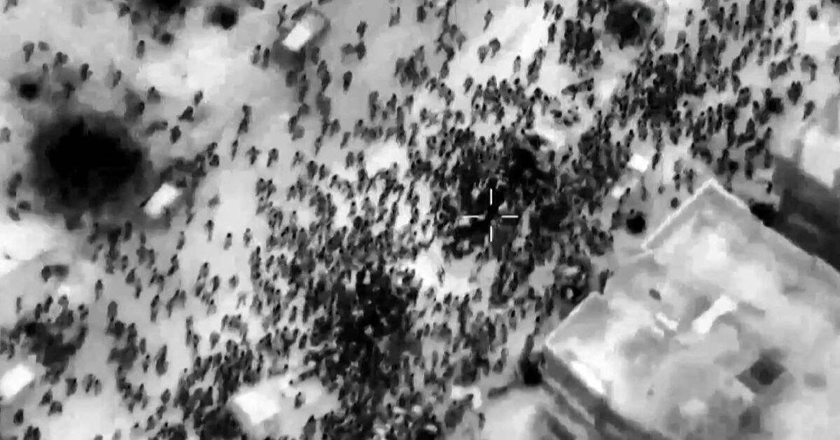 Aerial footage distributed by the Israeli military showed large groups approaching a line of moving trucks on foot.